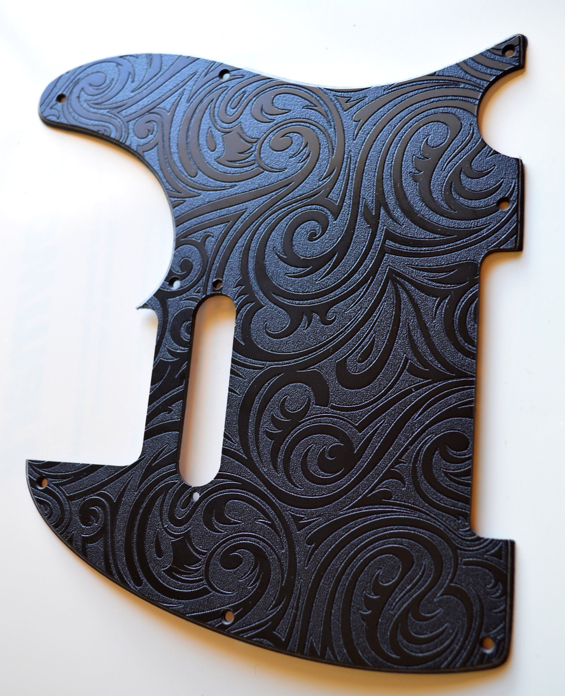 This is a custom black spiral textured standard Telecaster pickguard from Beyond Custom Guitars.