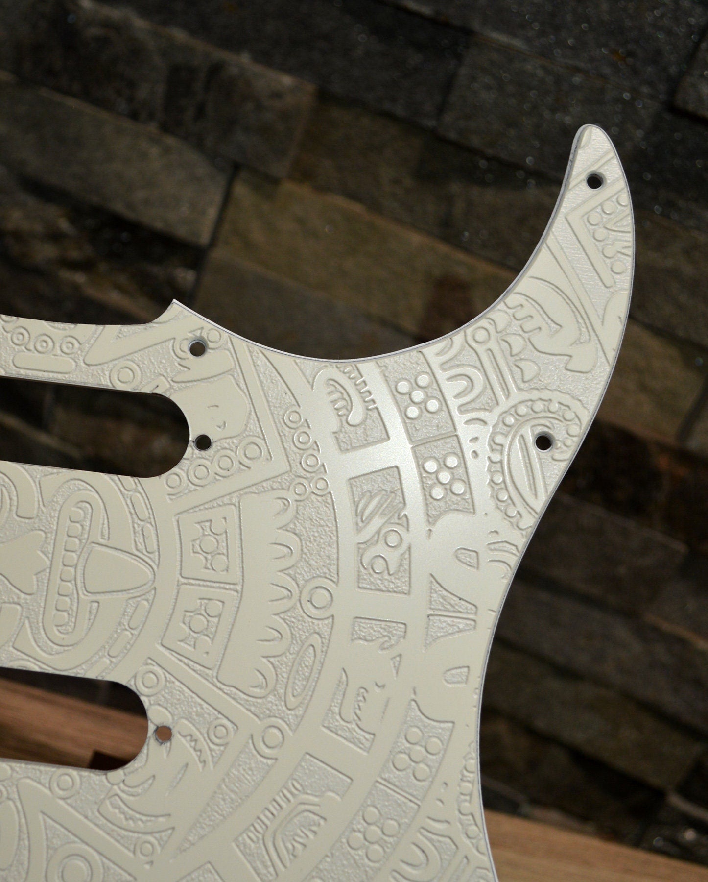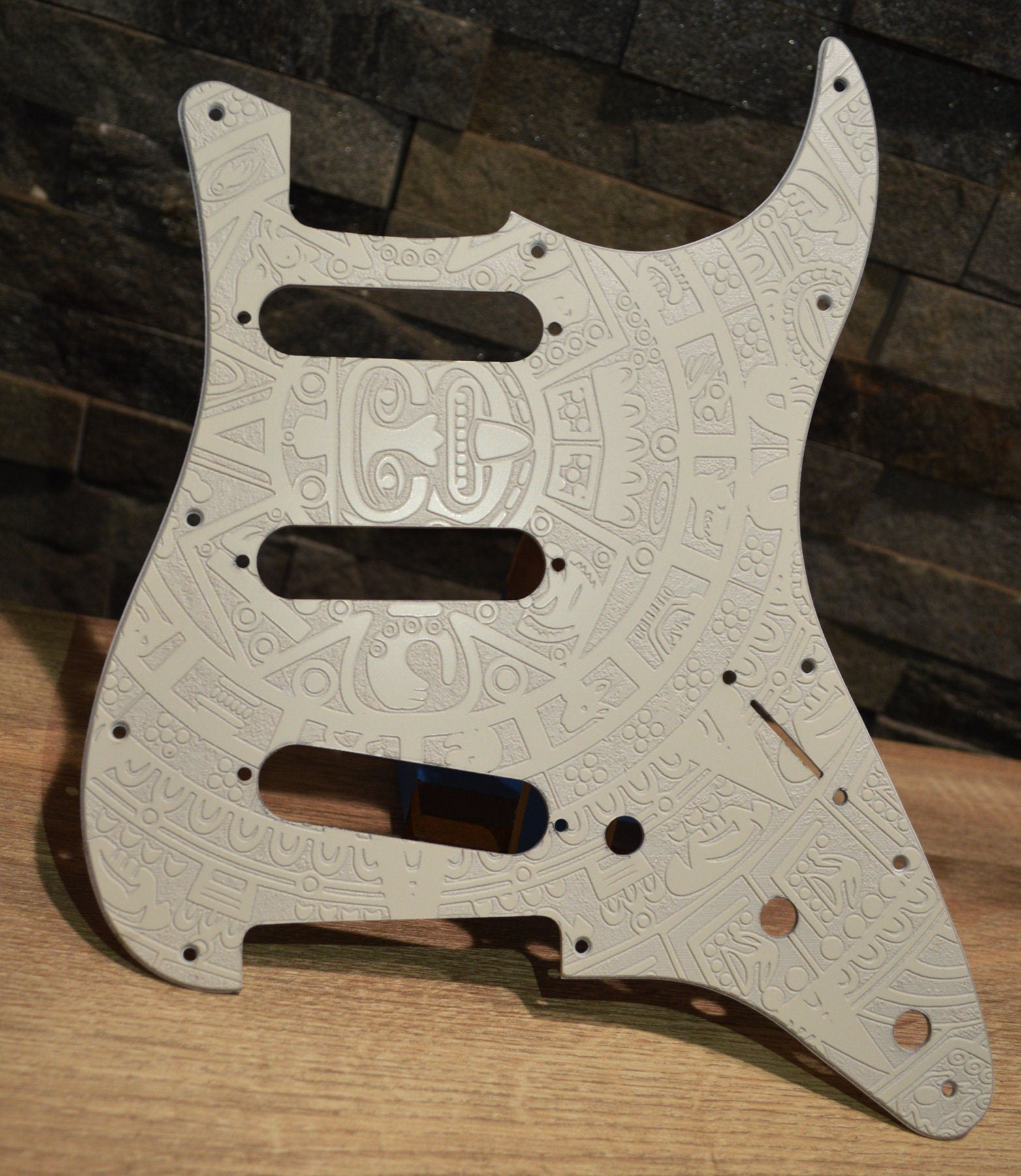 Ash white Mayan textured standard Stratocaster pickguard from Beyond Custom Guitars.