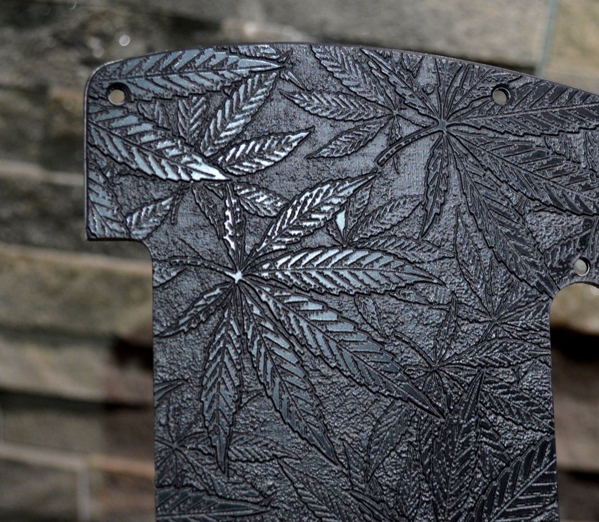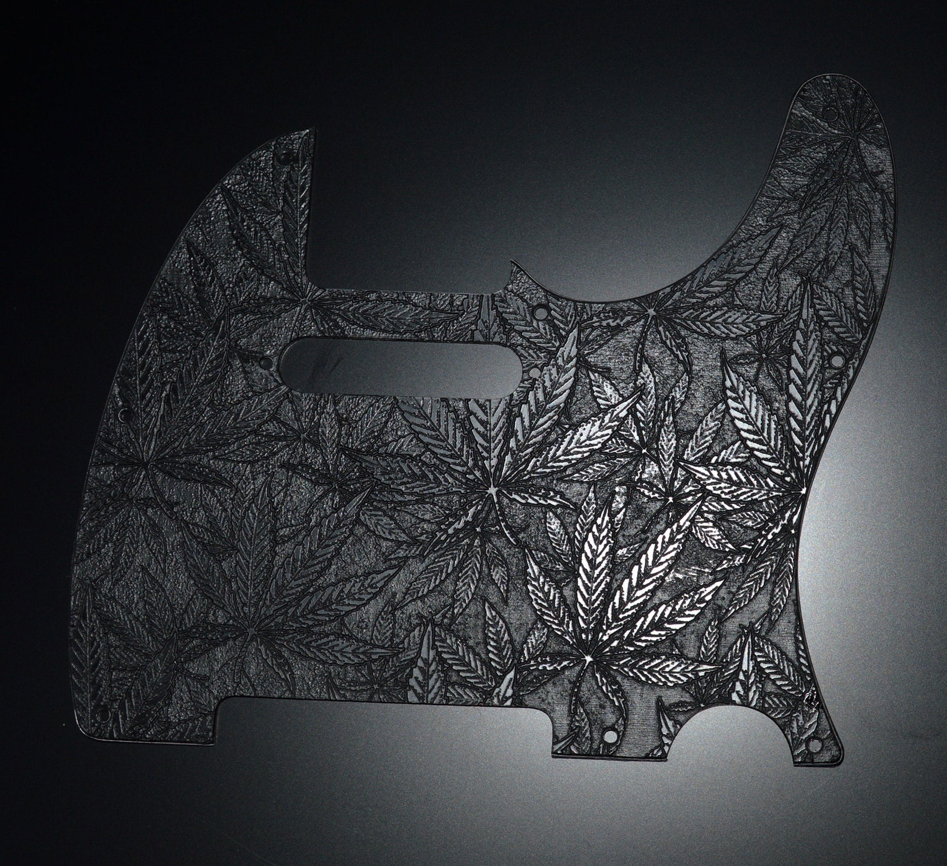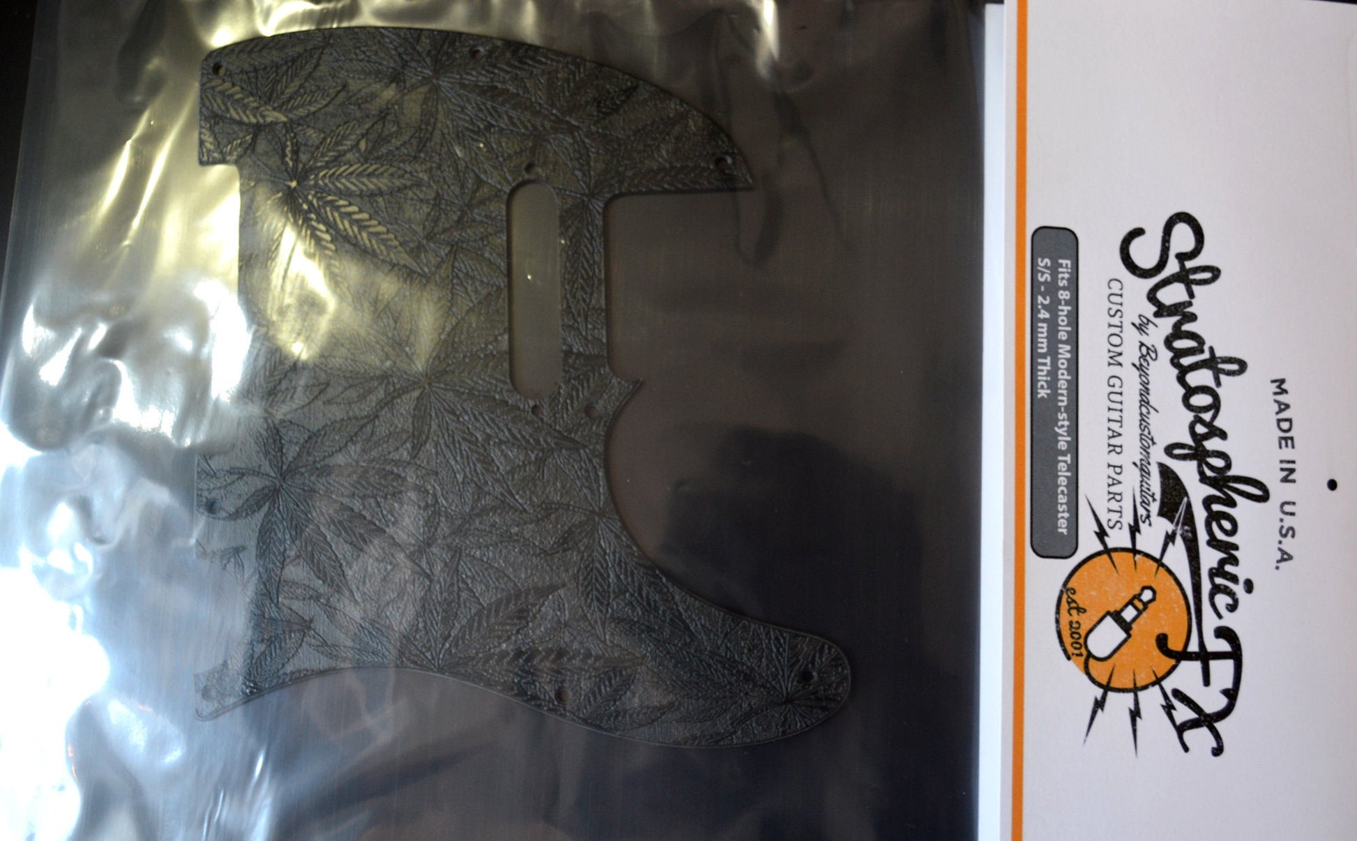 This is a custom black cannabis textured standard Telecaster pickguard from Beyond Custom Guitars.