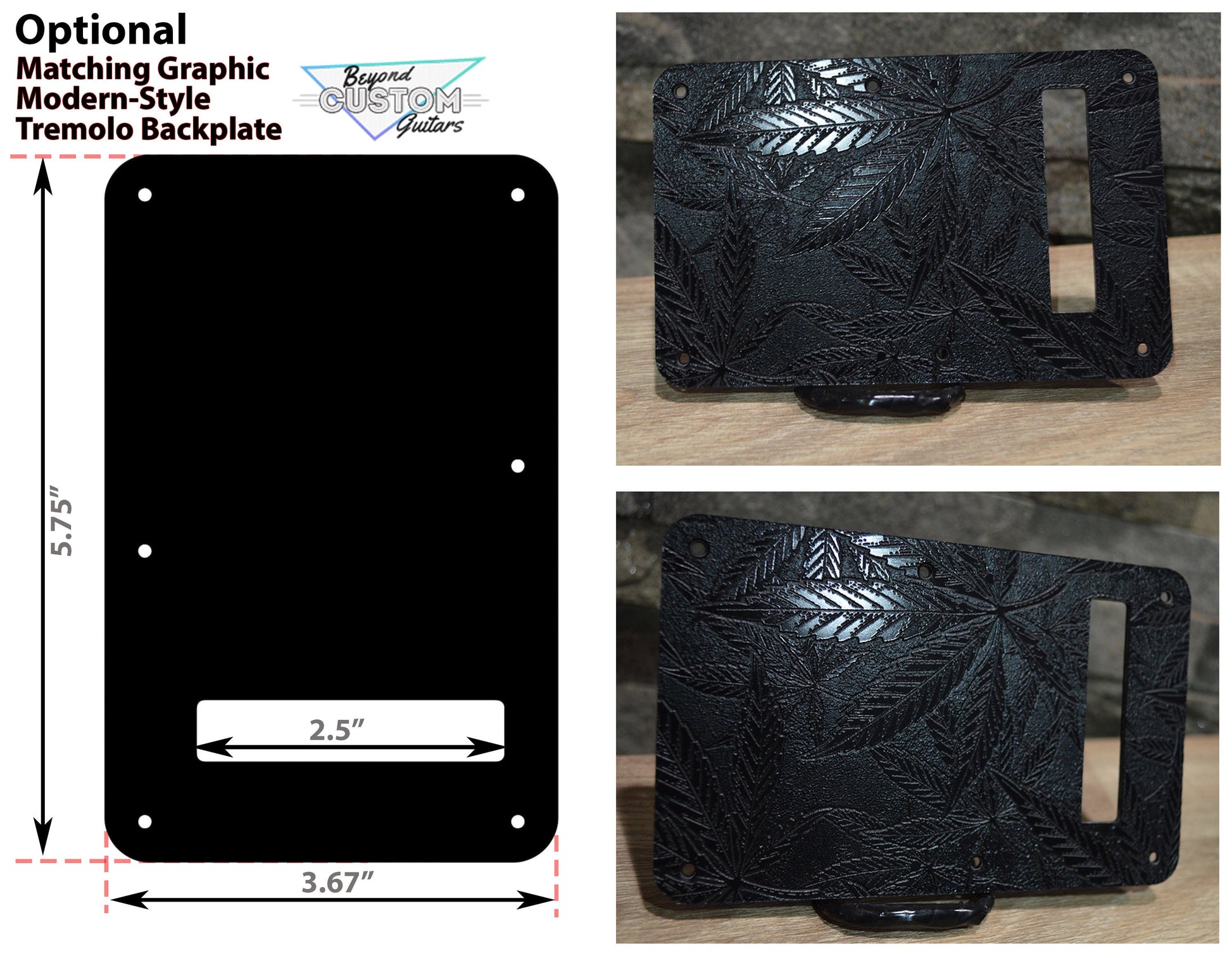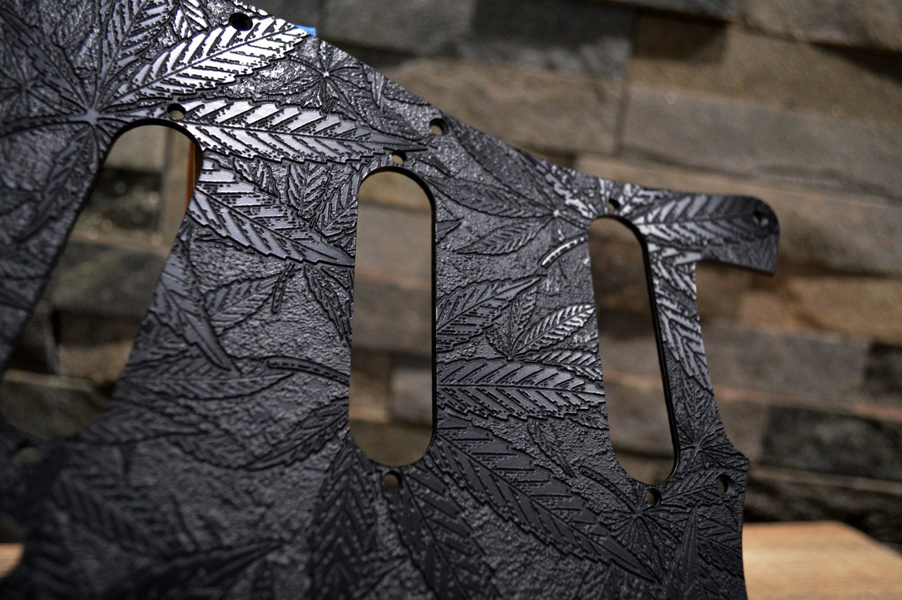 Black cannabis leaf textured standard Stratocaster pickguard from Beyond Custom Guitars.