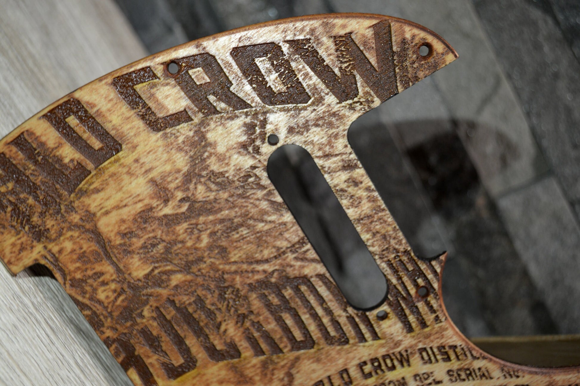 This is a heavily distressed Old Crow Bourbon label Textured laser engraved baltic birch pickguard for a Modern 8 hole standard Fender Telecaster.