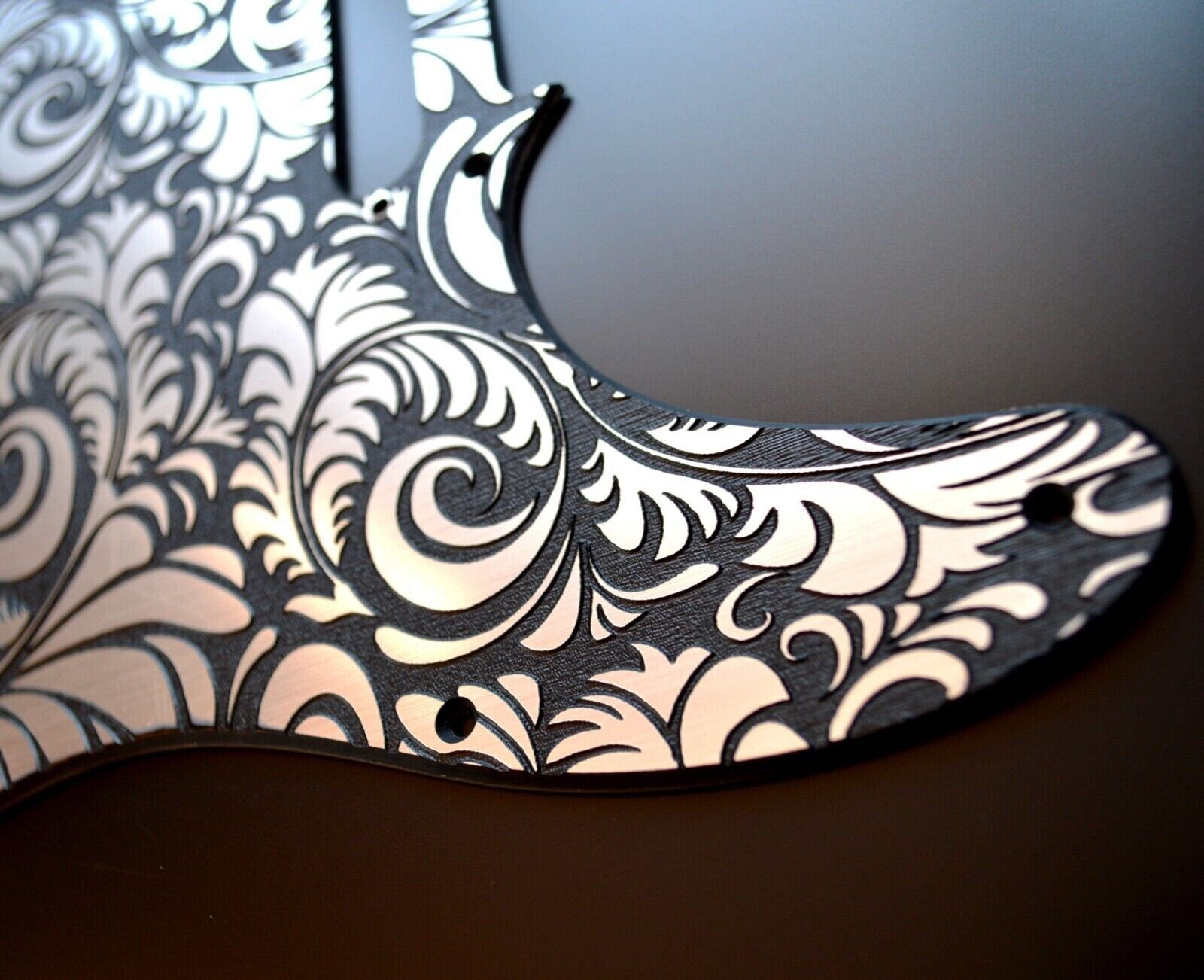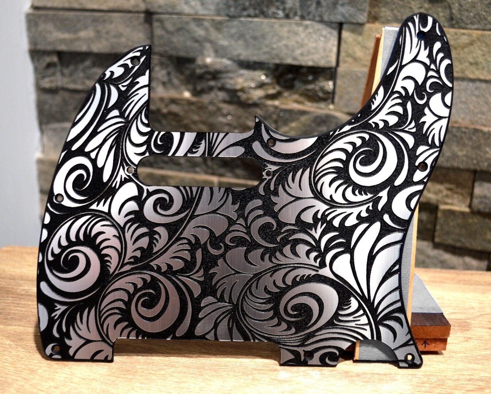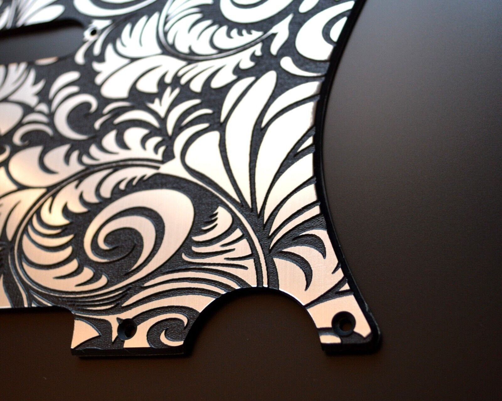 this pickguard is laser cut and engraved in a paisley pattern on brushed metallic acrylic plastic with a semi reclective appearance to provide the look and luster of real brushed metal.