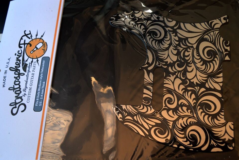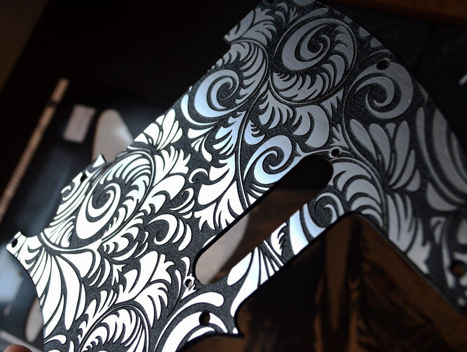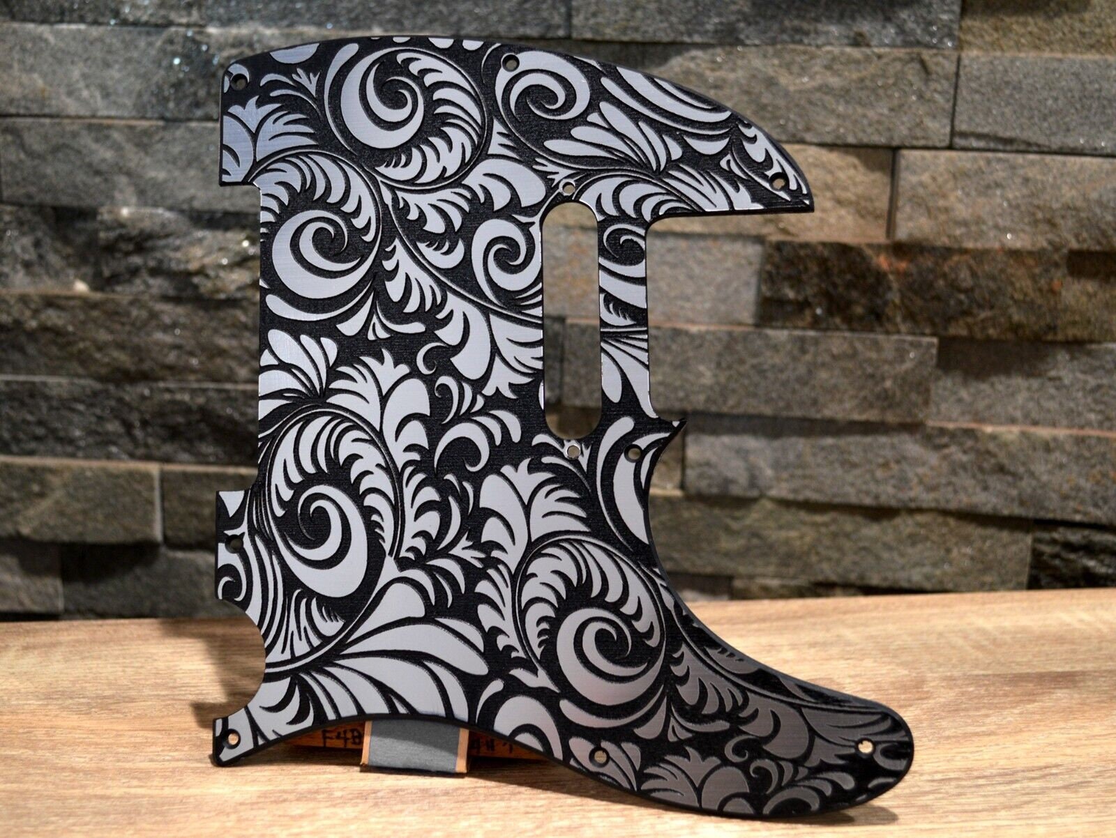 this pickguard is laser cut and engraved in a paisley pattern on brushed metallic acrylic plastic with a semi reclective appearance to provide the look and luster of real brushed metal.