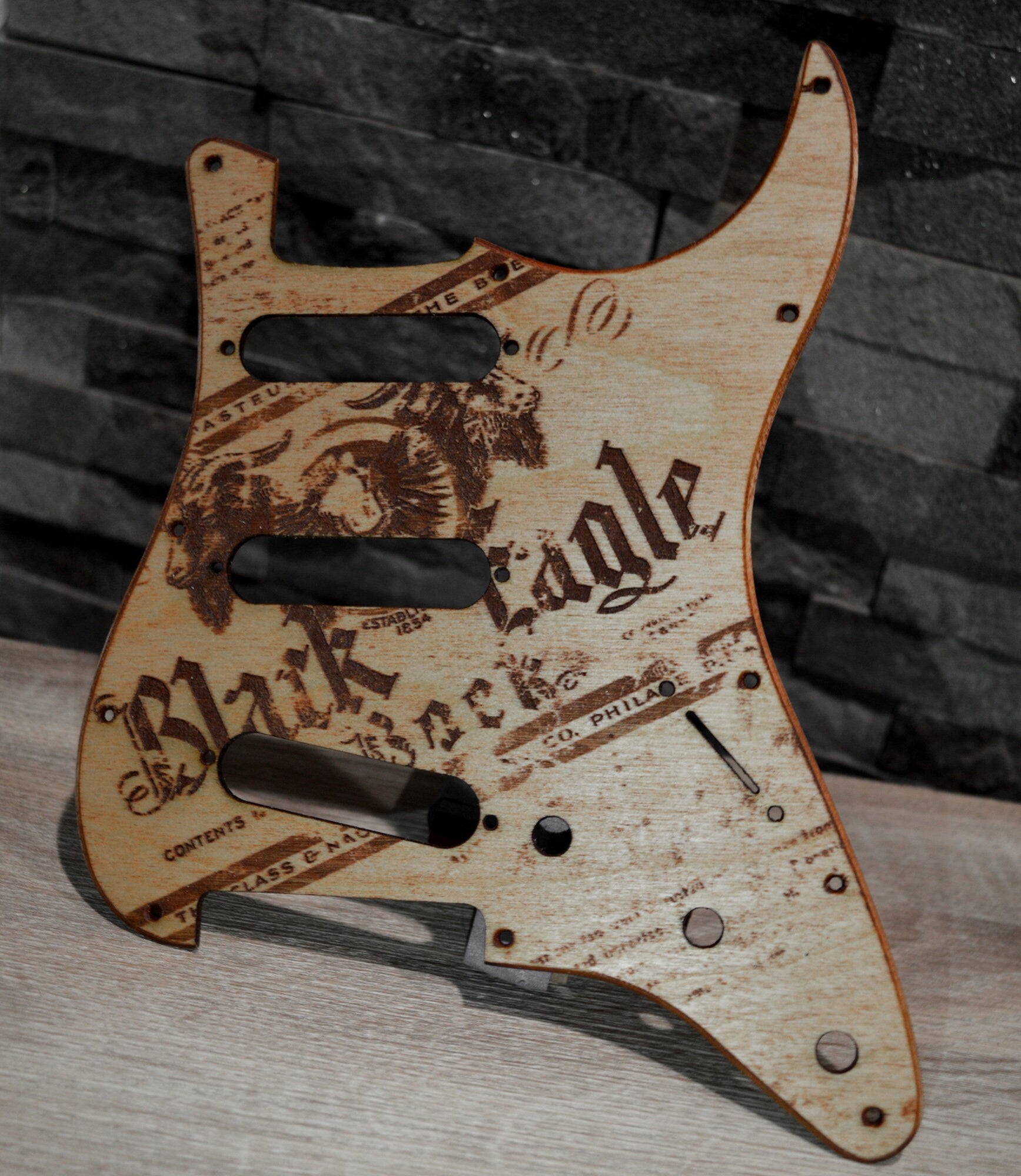 This is a custom laser engraved Vintage Black Eagle Bock pickguard for a Modern 11 hole standard Fender Stratocaster. 3 tone/vol pots, and 5 way blade switch.