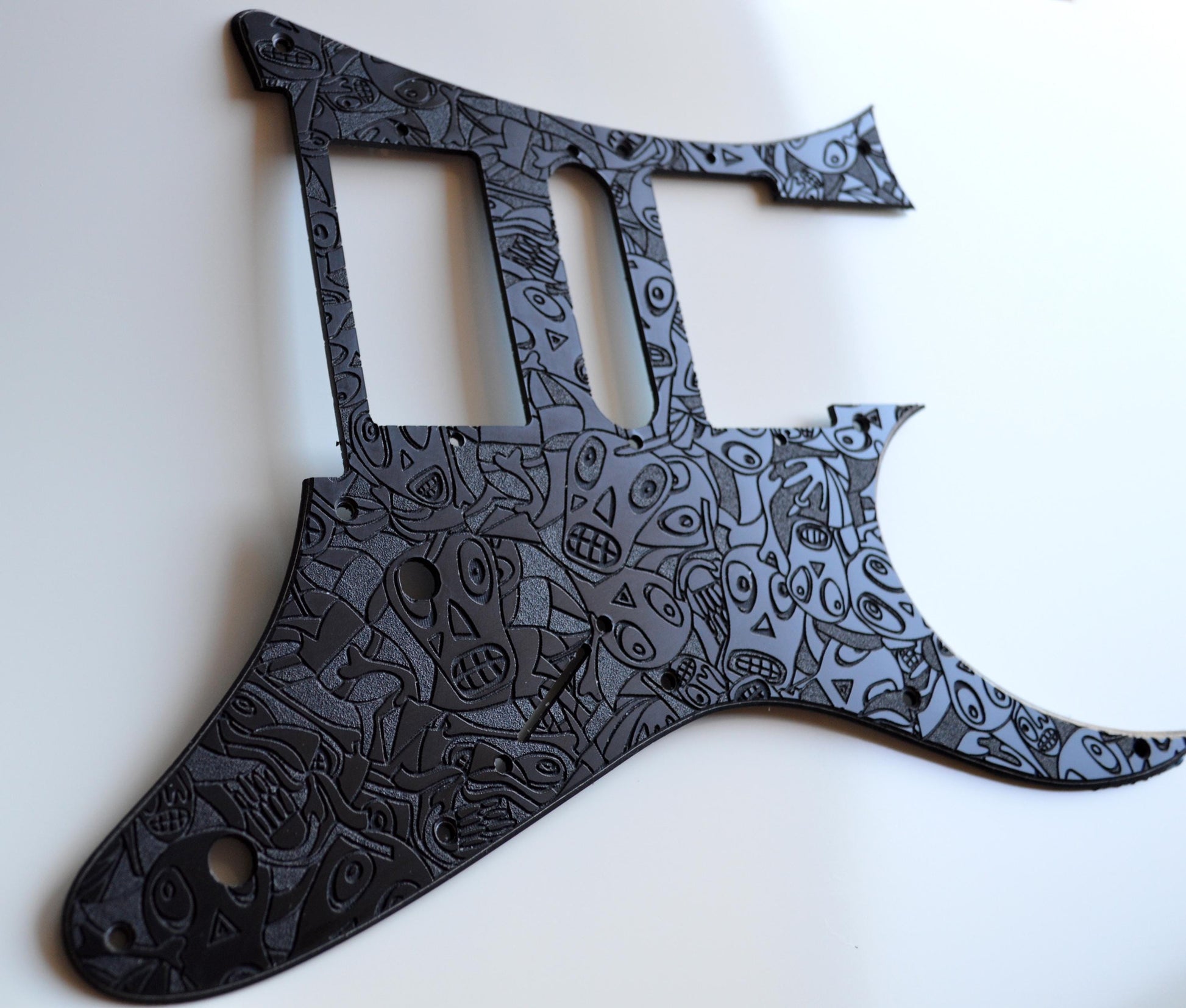 Custom Black Donnie Hunt Faces Textured Replacement pickguard for IBANEZ JEM or RG 550 series guitars. Designed as a replacement for Japanese made Ibanez guitars.