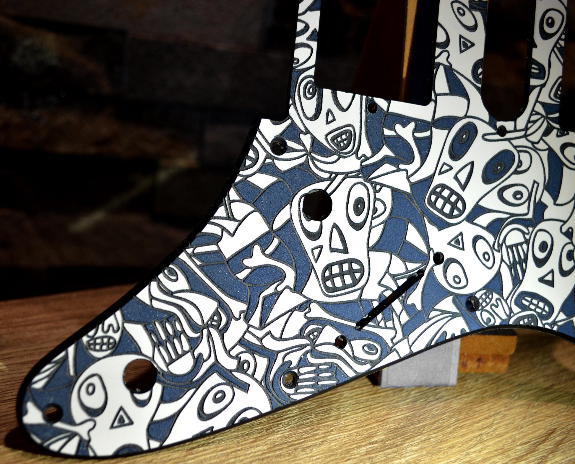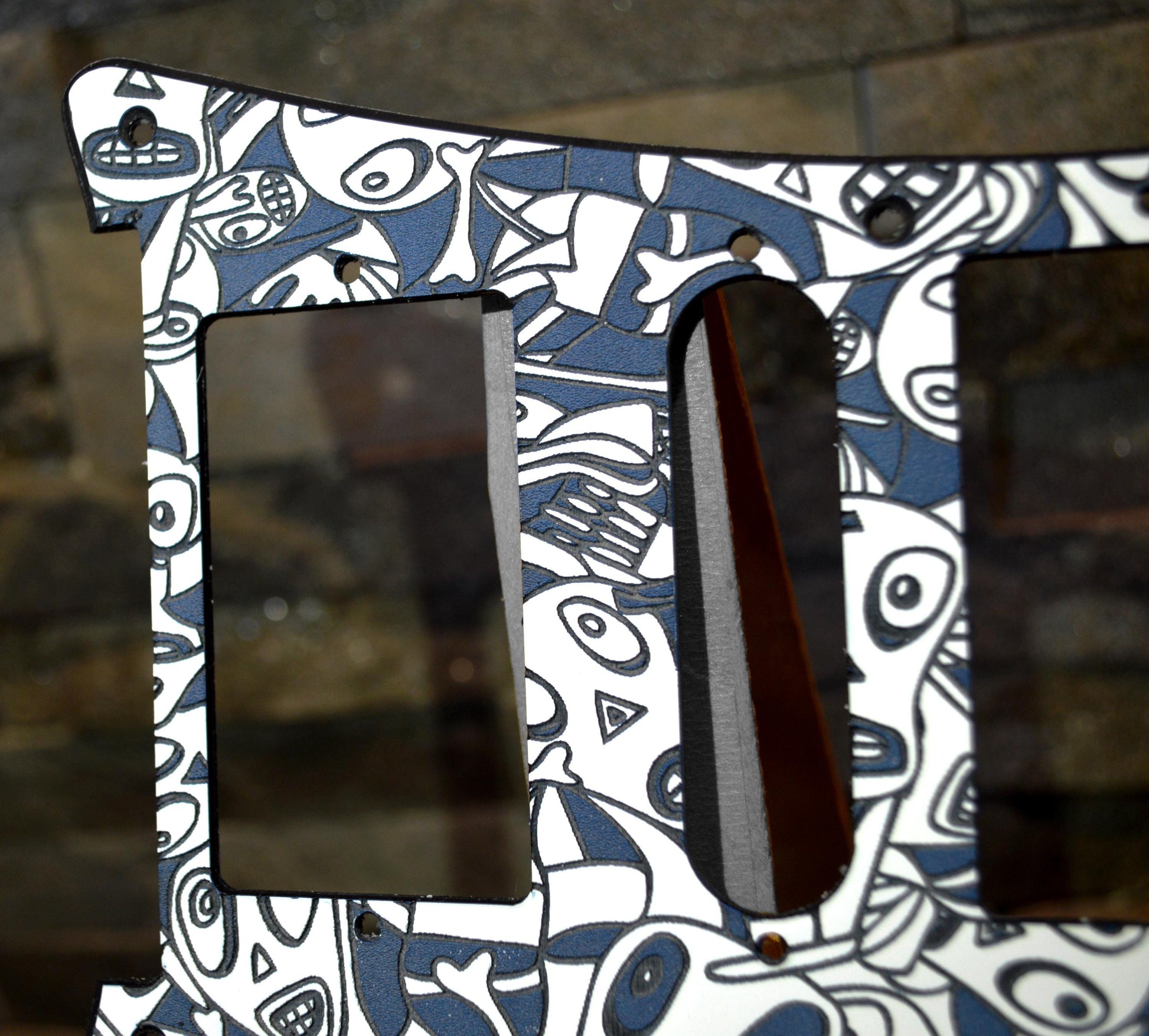 Custom Blue / Tri Color Donnie Hunt Faces Textured Replacement pickguard for IBANEZ JEM or RG 550 series guitars. Designed as a replacement for Japanese made Ibanez guitars.