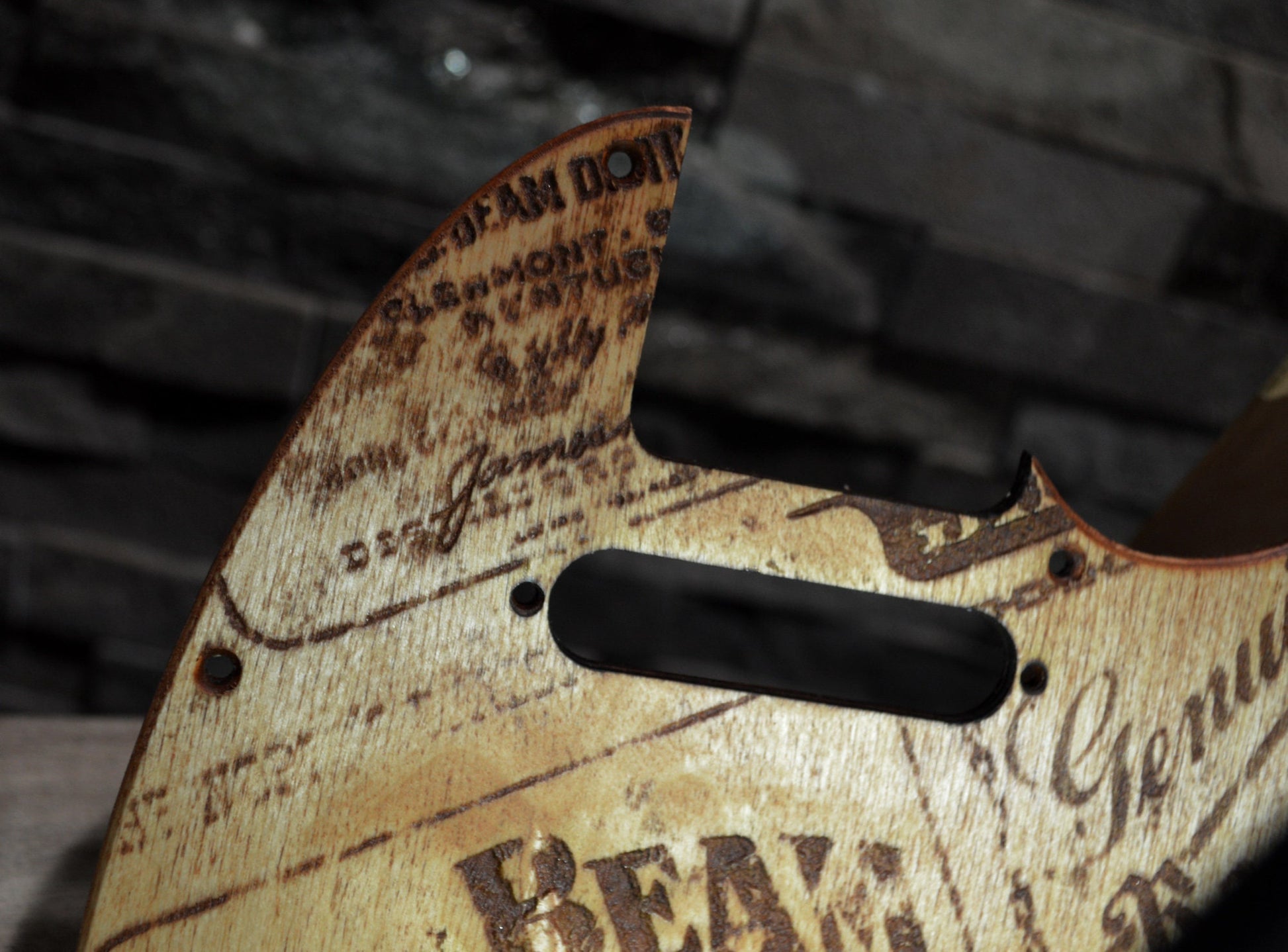 This is a heavily distressed Vintage Jim Beam label Textured laser engraved baltic birch pickguard for a Modern 8 hole standard Fender Telecaster.