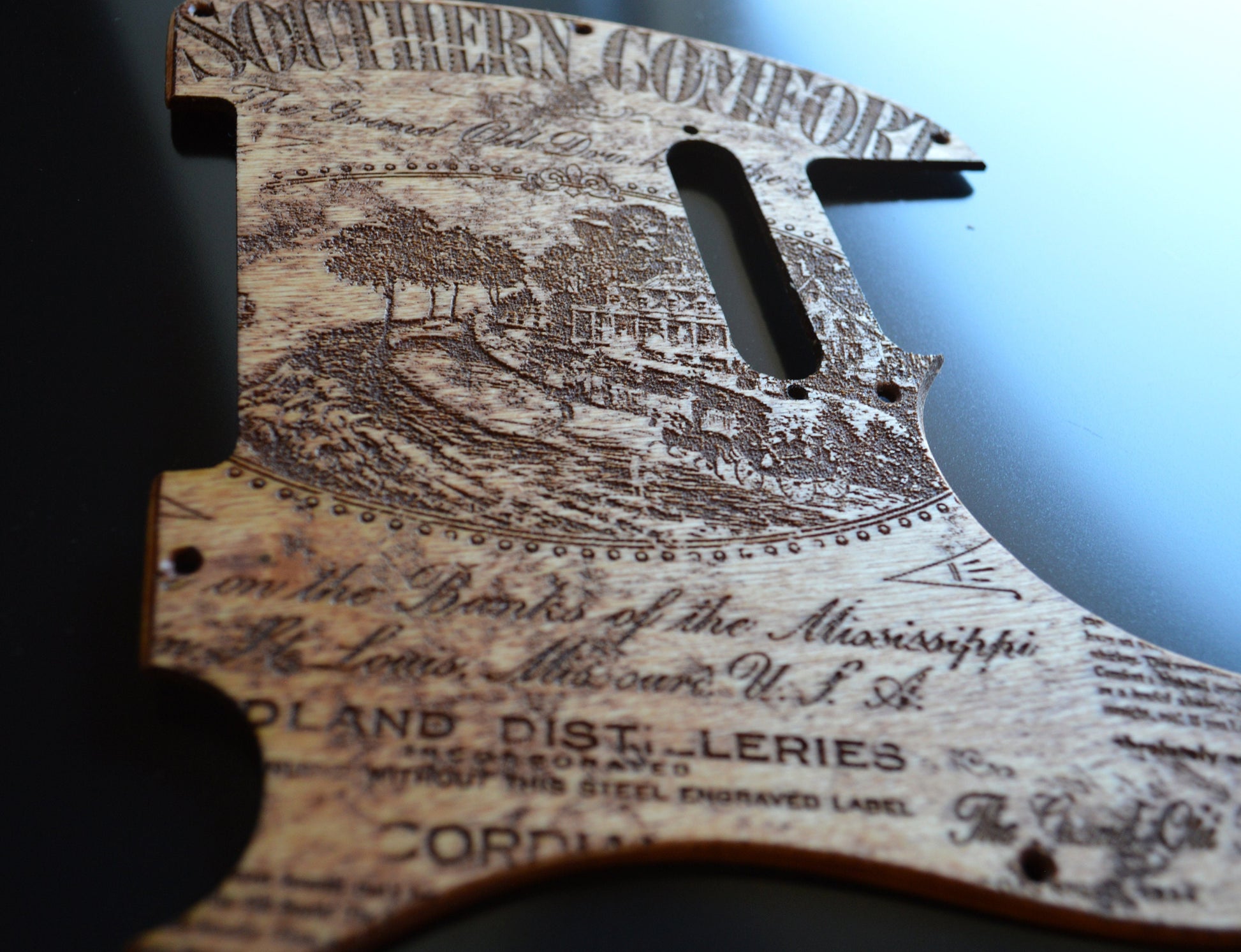 Distressed vintage Southern Comfort label Textured laser engraved baltic birch pickguard for a Modern 8 hole standard Fender Telecaster.