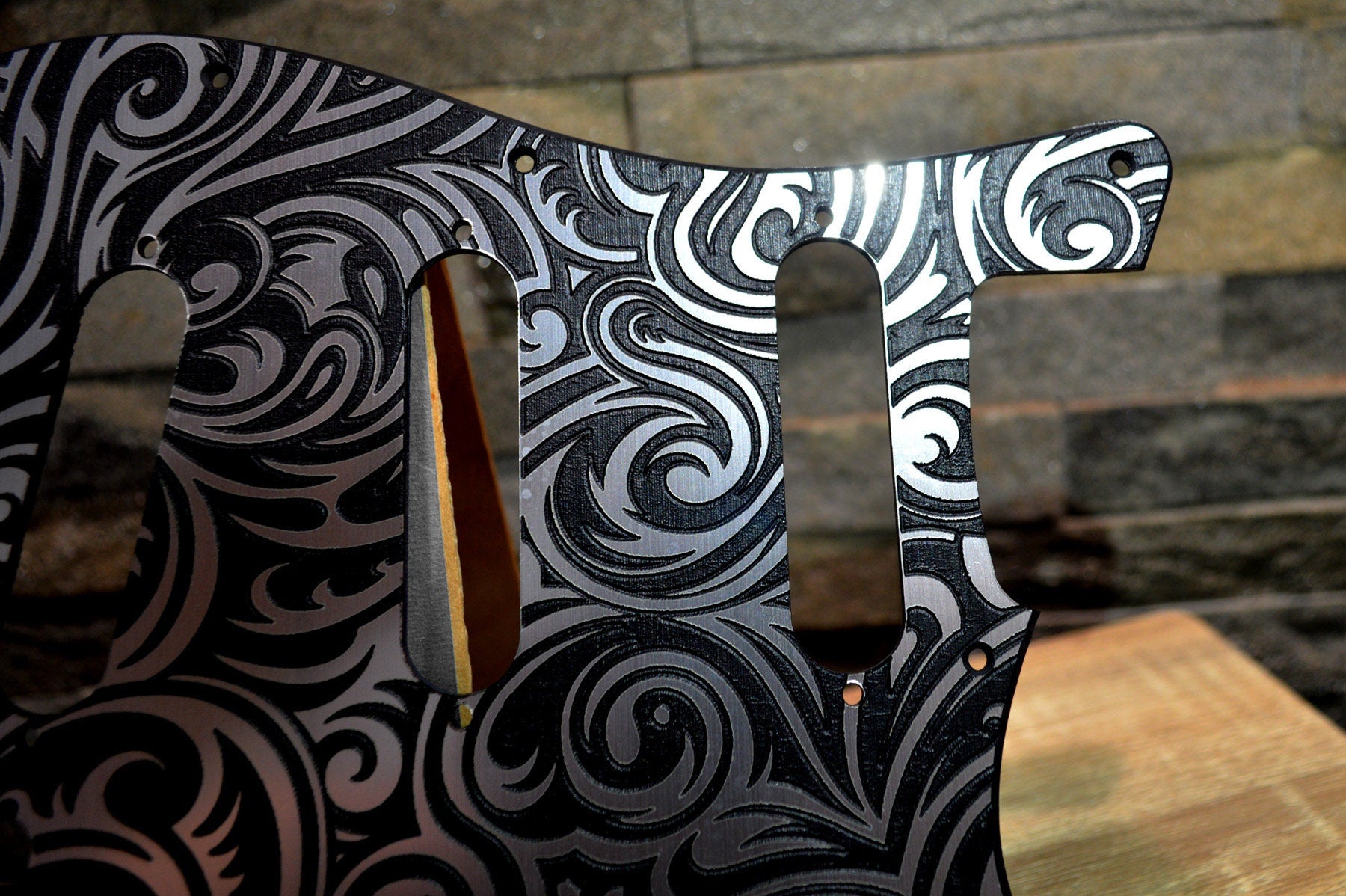 This custom pickguard is laser cut and engraved in a pattern on brushed metallic acrylic plastic with a semi reclective appearance to provide the look and luster of real brushed metal