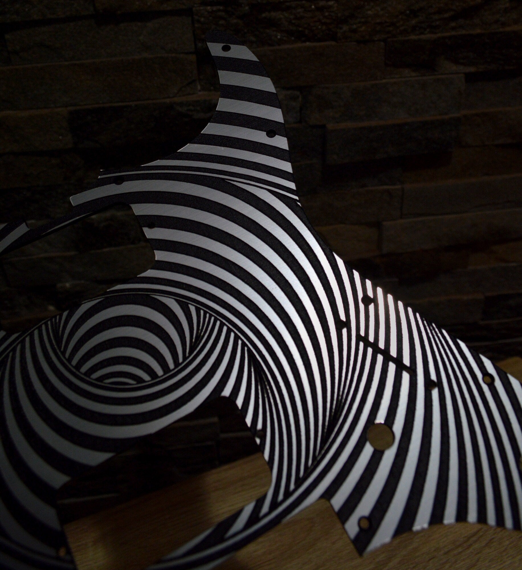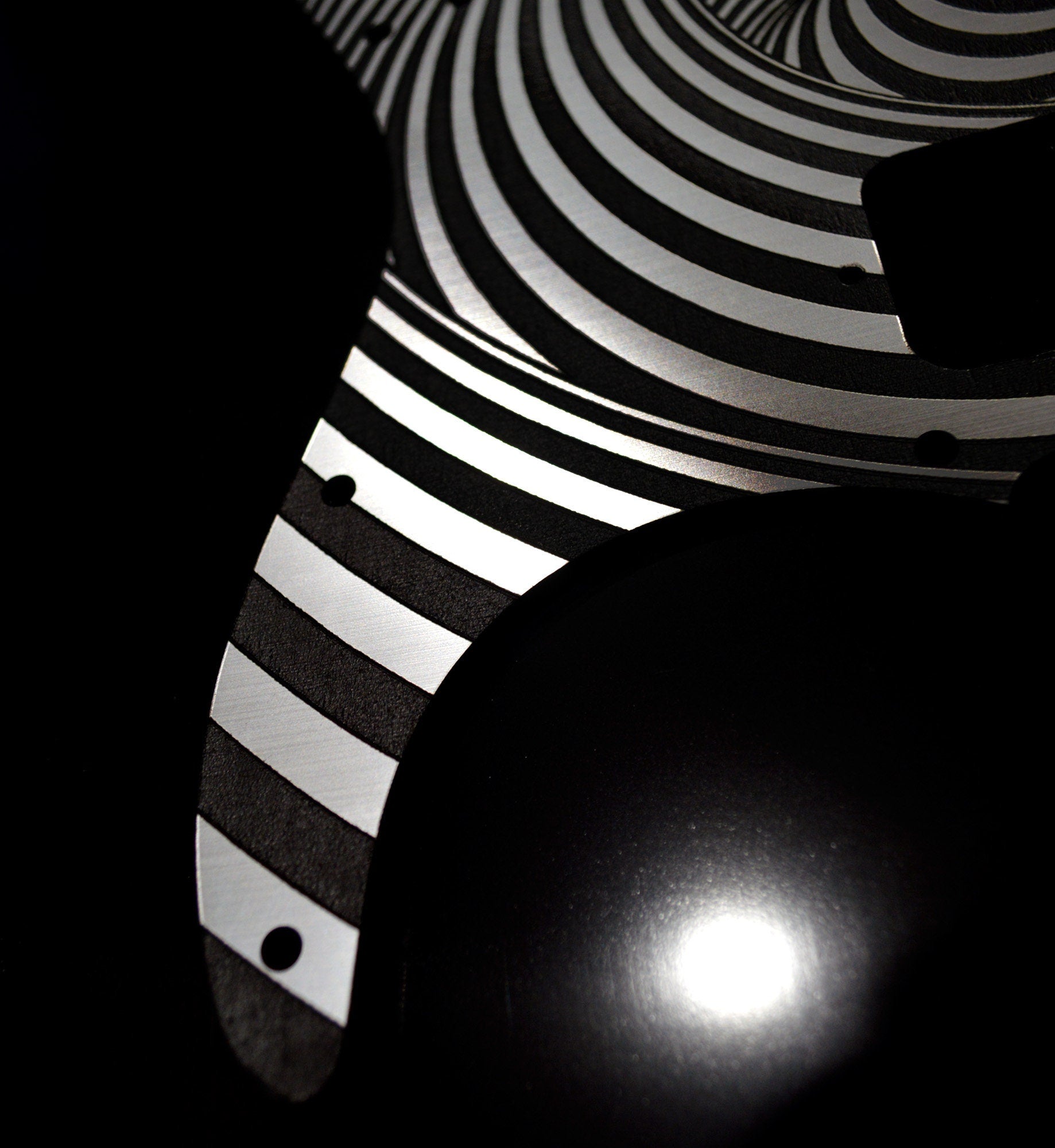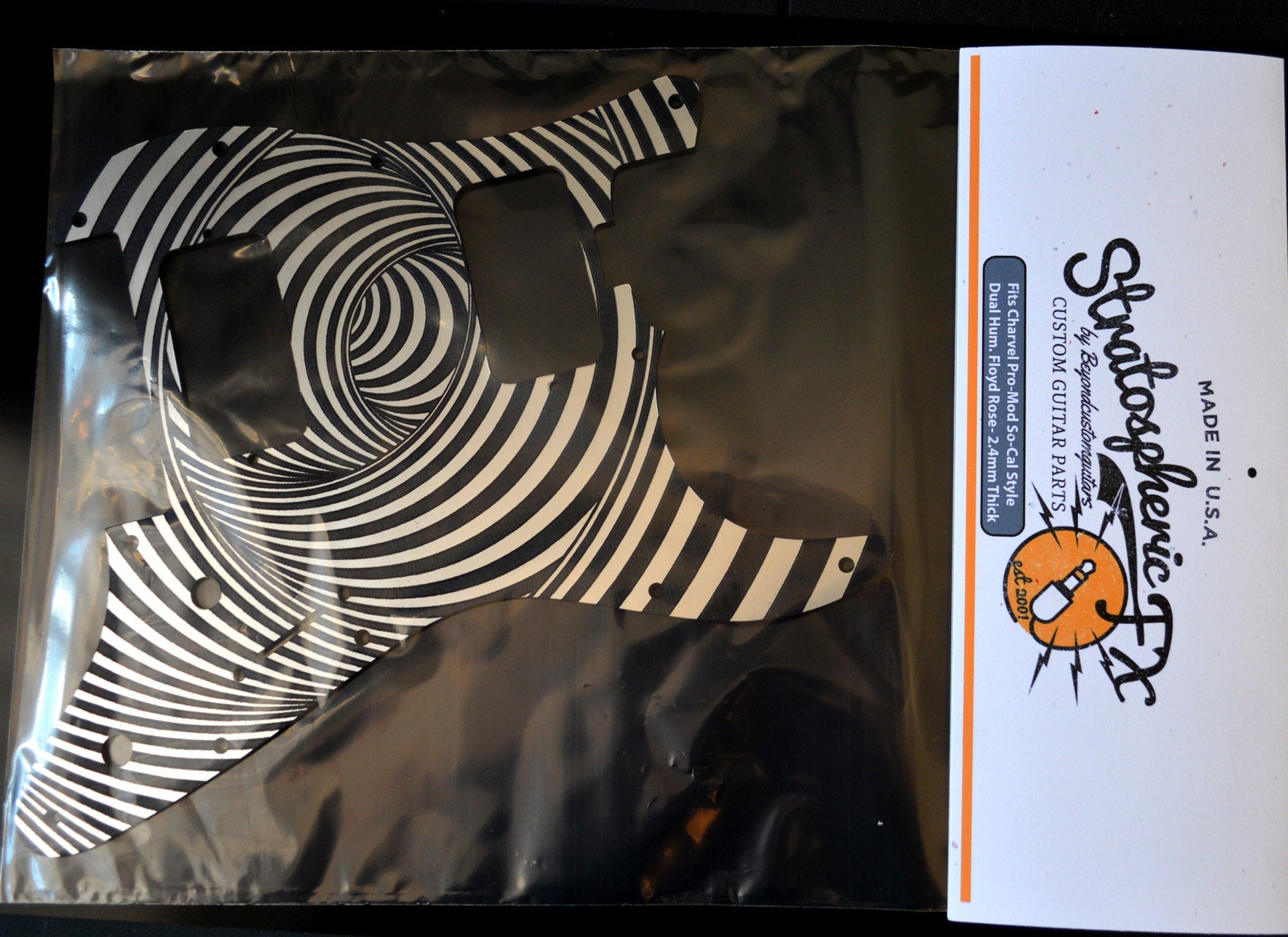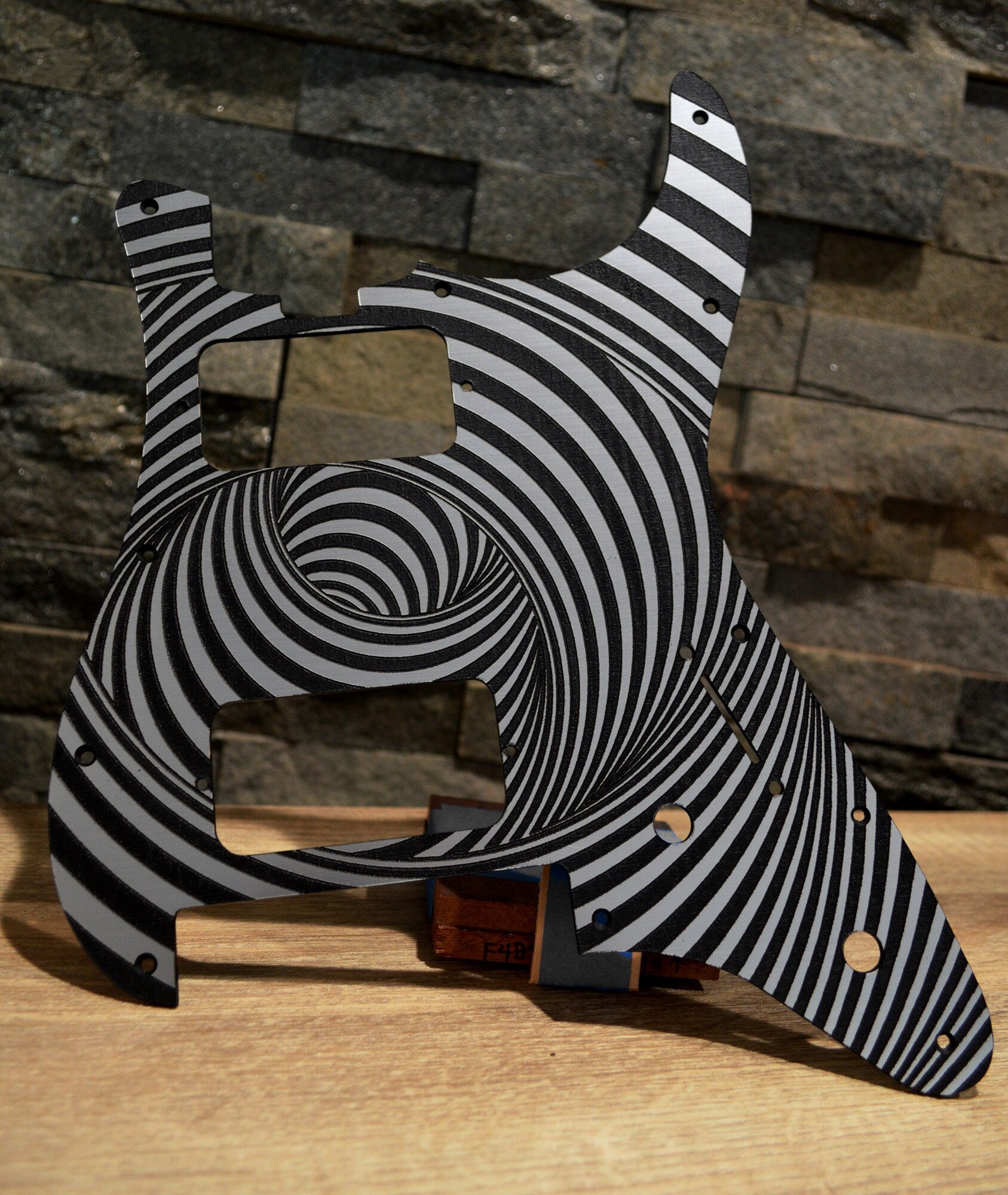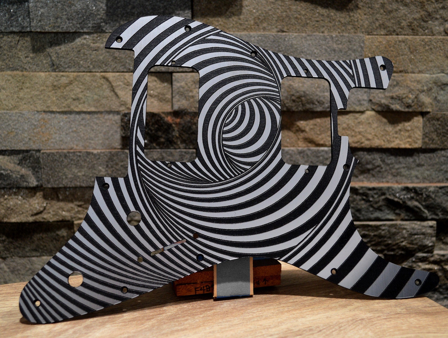 Custom laser engraved, faux brushed aluminum offset bullseye pickguard for newer style Charvel Pro Mod – So Cal Style 1 Guitars with dual Humbuckers and Floyd Rose.