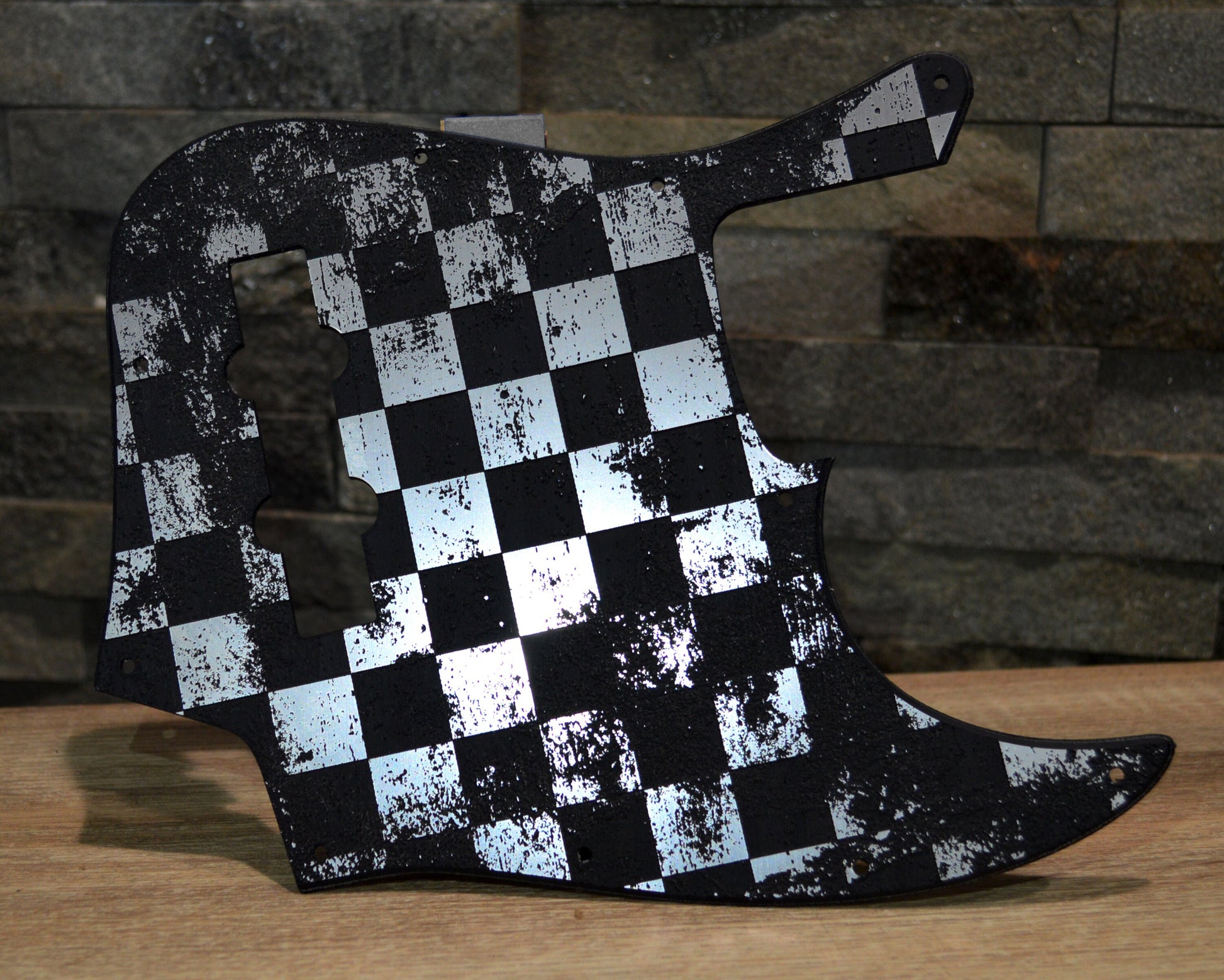 Faux brushed aluminum on black distressed checker textured standard Jazz Bass pickguard from Beyond Custom Guitars.