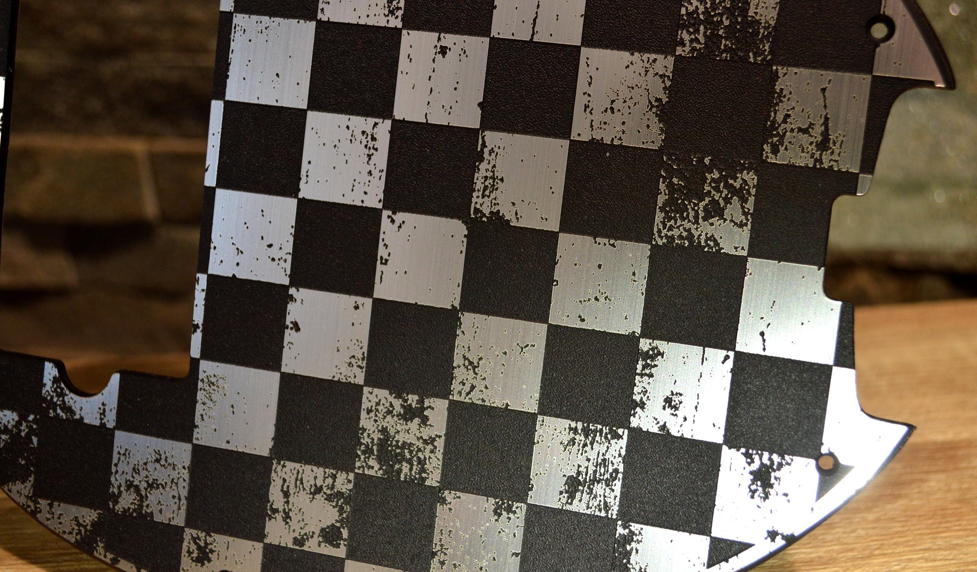 Faux brushed aluminum on black distressed checker textured classic stingray pickguard from Beyond Custom Guitars.