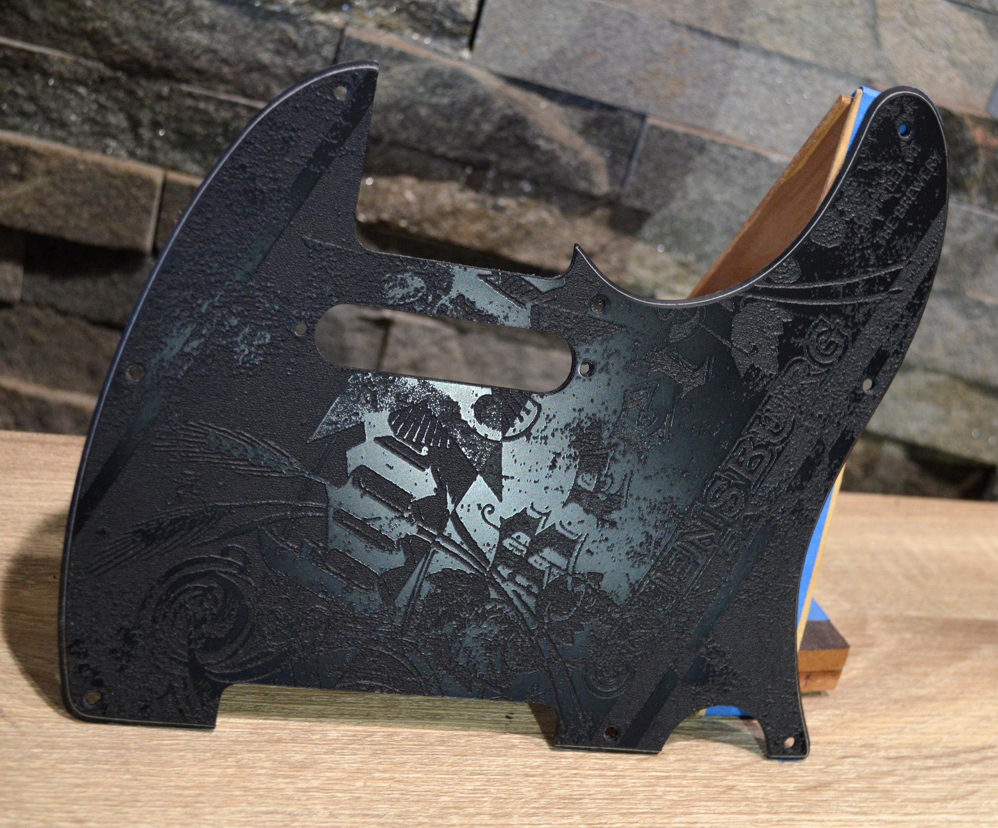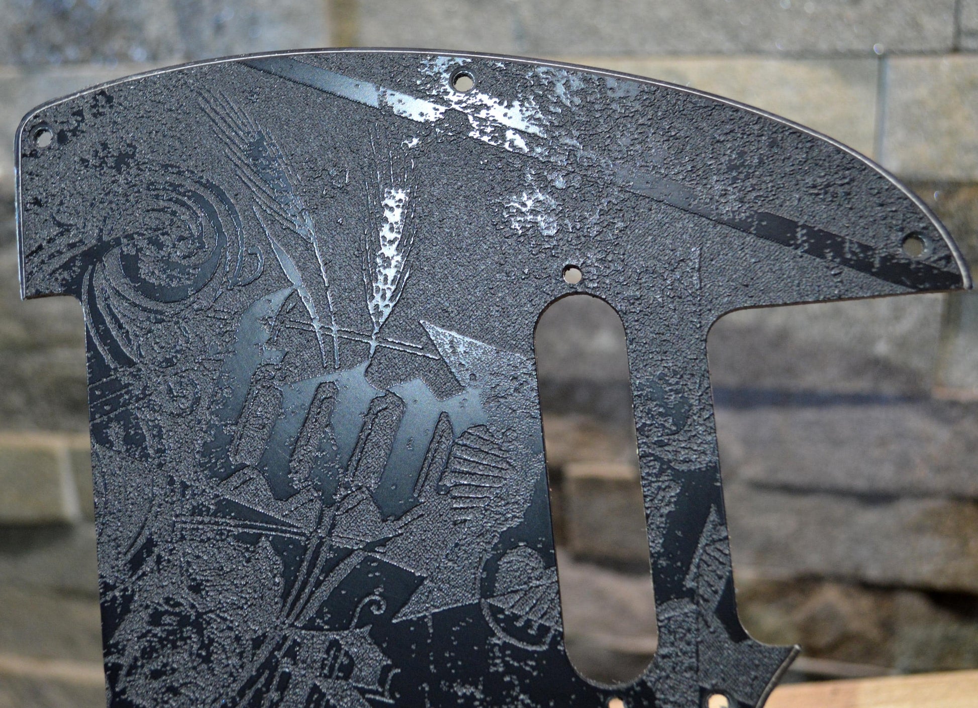 Custom distressed Star Brewing textured standard Telecaster pickguard in black from Beyond Custom Guitars.